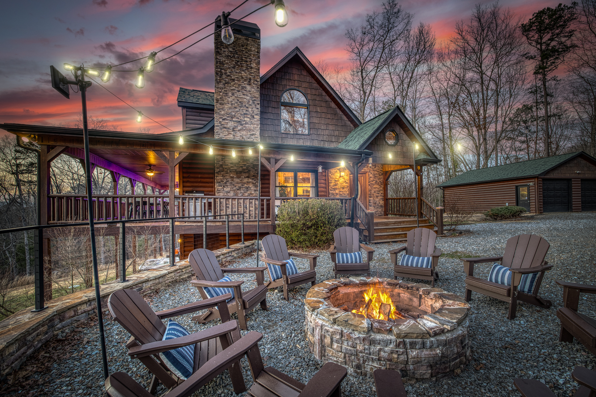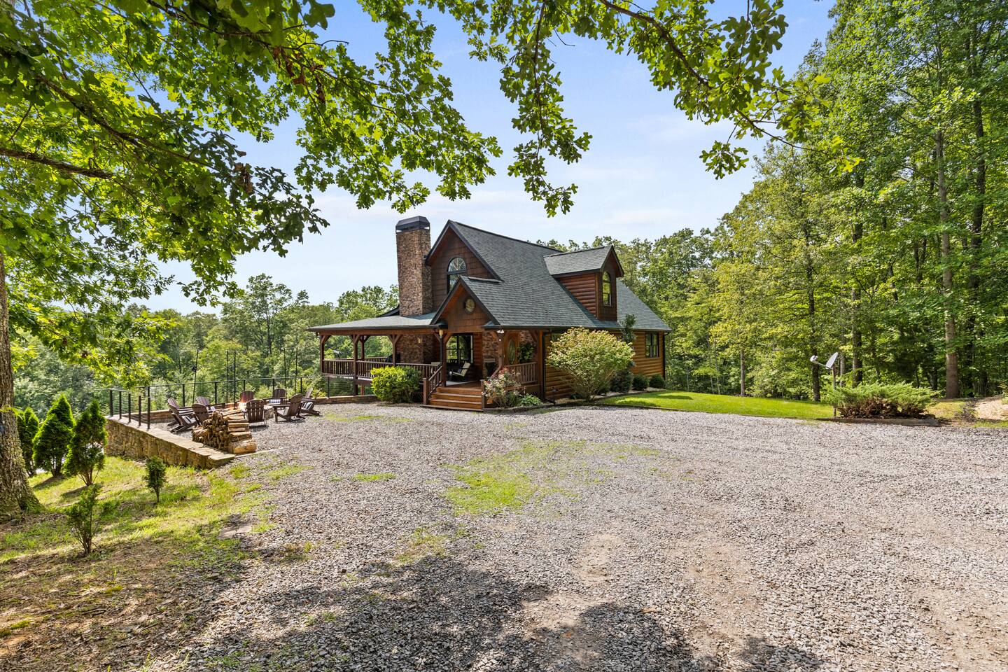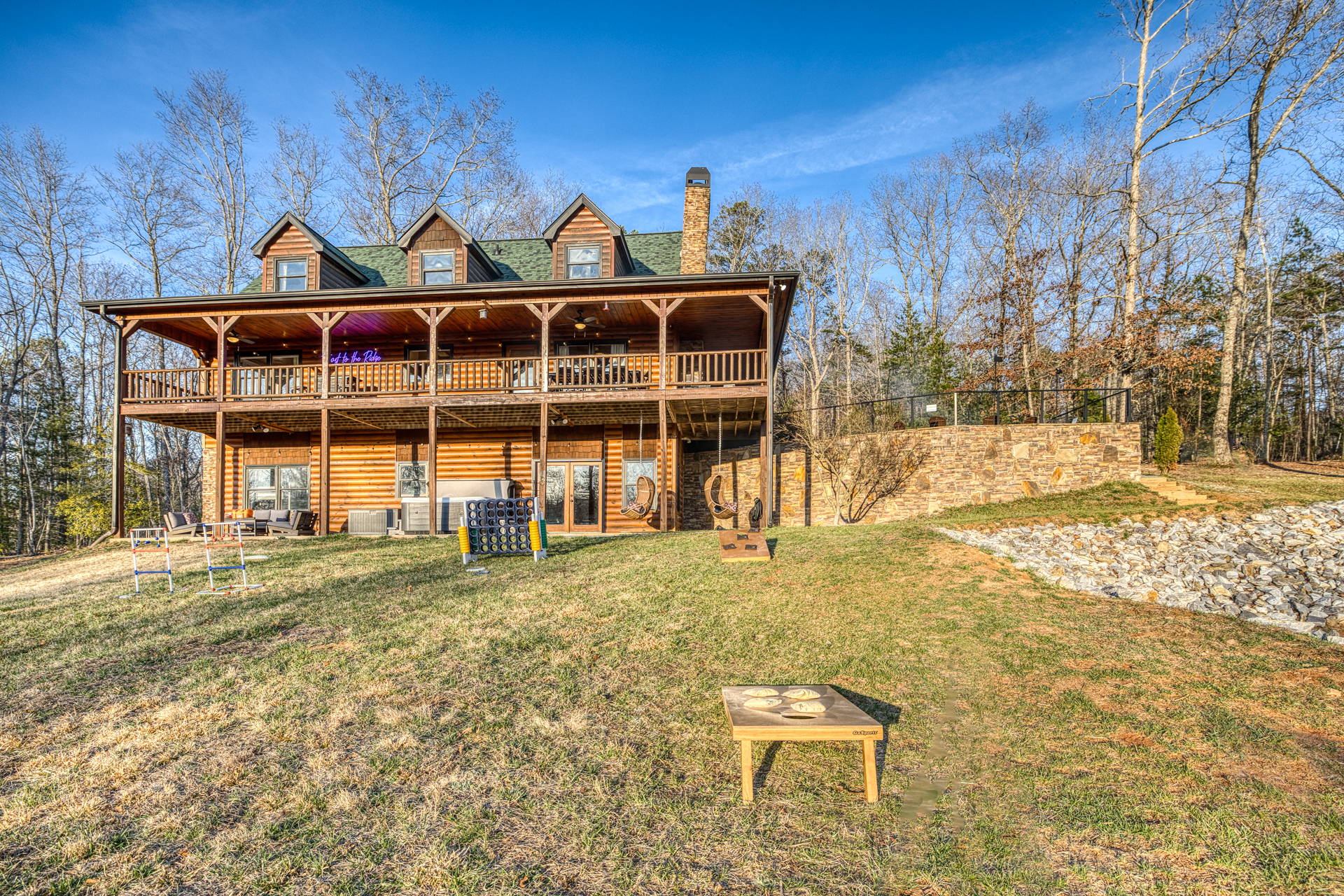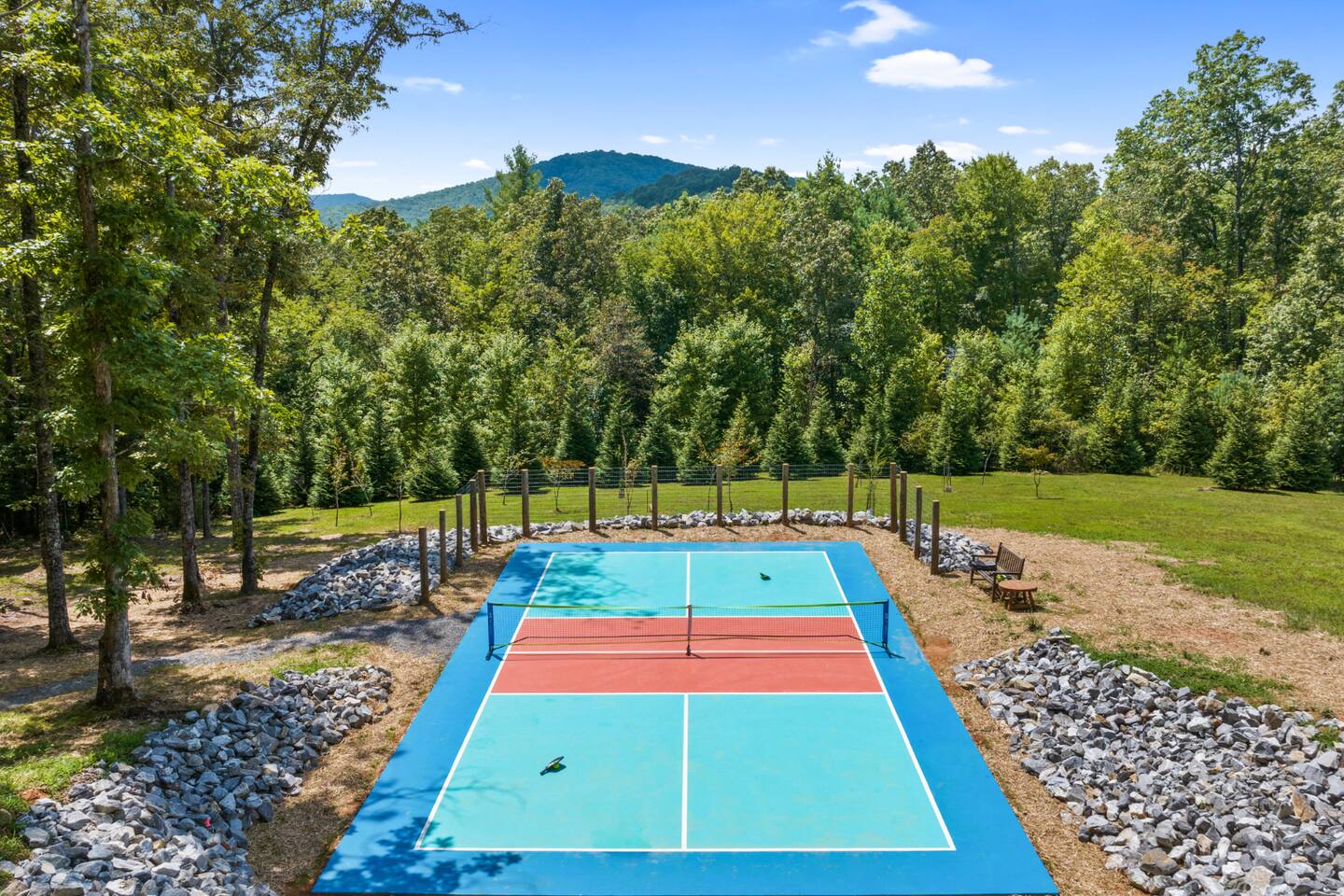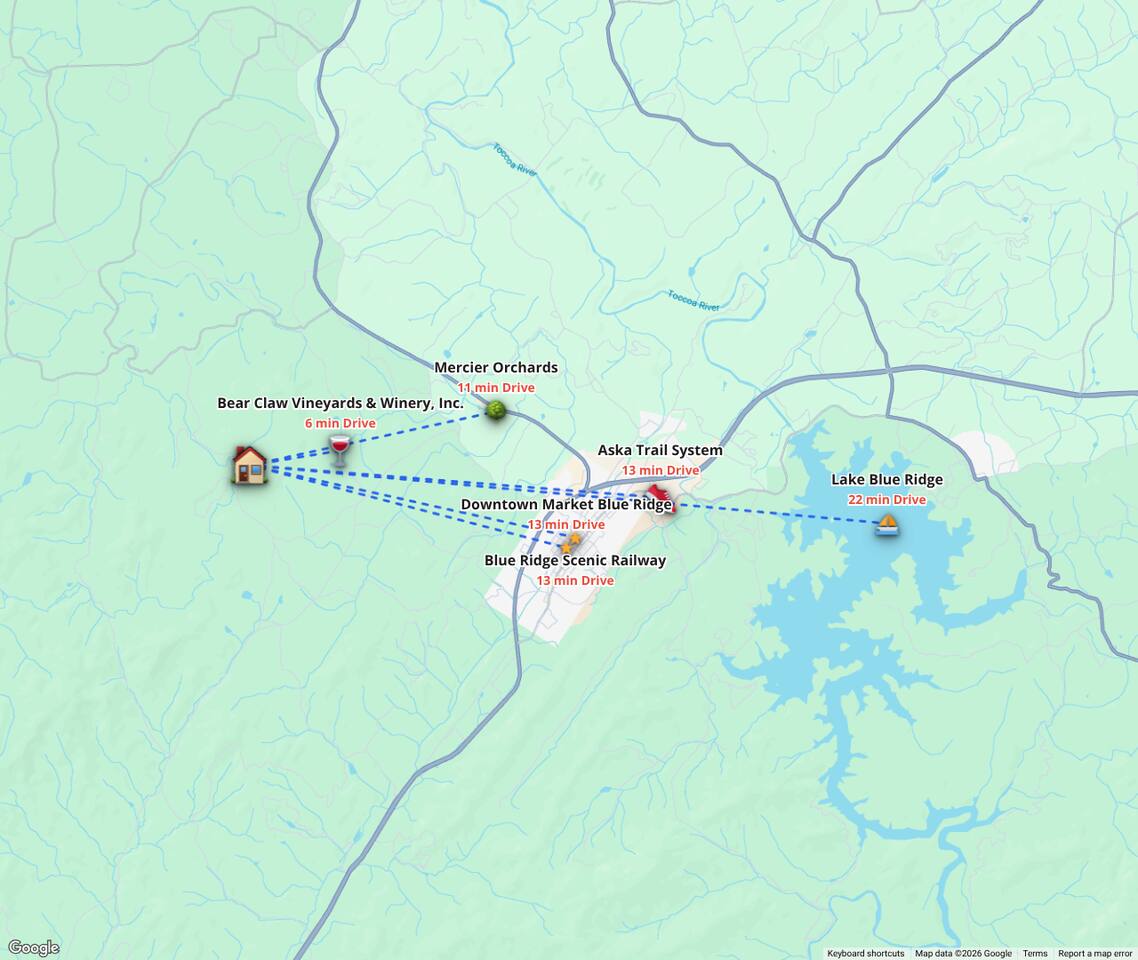 A one-of-a-kind retreat with a private pickleball court, wrap-around deck, covered hot tub, fire pit, and arcade-style game room. 🏷 Main Floor Kitchen & Dining Room ∙ FULLY stocked kitchen w/plenty of counterspace for at-home baking and cooking ∙ Elegant KEUREG, coffee maker, tea kettle, blender and toaster ∙ Cooking oils and seasoning essentials ∙ Abundance of dishware, glassware and silverware, including children’s ∙ Full-sized fridge and freezer ∙ Gas stove and oven ∙ Cuisinart coffee maker ∙ BLACK DECKER coffee drip ∙ Microwave ∙ Airfryer ∙ Trash compactor ∙ Dishwasher ∙ Dining room table, seating for 8 ∙ Large countertop space for food preparation ∙ Breakfast table, 2 high chairs Living Room ∙ 50” Smart TV ∙ Netflix, Prime Video, Disney Plus, Hulu, HBO and more ∙ Sound system ∙ Vaulted ceiling ∙ Fireplace ∙ Ceiling fan ∙ Comfortable velvet sofa ∙ Access to upper deck/balcony Laundry Room ∙ GE high-efficiency washer/dryer ∙ Tide Free and Gentle ∙ Hangers ∙ Drying rack Bedroom #3 ∙ King size bed ∙ Premium mattress and comforter ∙ Smart TV ∙ Room darkening shades ∙ Bedside table and lamp ∙ Large closet w/ hangers ∙ Dresser ∙ Ceiling fan ∙ Full-lenght mirror Bathroom #2 ∙ Shower ∙ Bathtub ∙ Single vanity with oversized mirror and plenty of counterspace ∙ Shampoo, conditioner and body soap ∙ Makeup washcloth 🏷 2nd Floor Bedroom #1 (Primary Bedroom) ∙ King size bed ∙ Premium mattress and comforter ∙ Smart TV ∙ Room darkening shades ∙ Bedside table and lamp ∙ Large closet w/ hangers ∙ Bedroom bench ∙ Dresser ∙ Full-lenght mirror ∙ Workstation/reading table Bathroom #1 (Ensuite) ∙ Shower ∙ Bathtub ∙ Single vanity with oversized mirror and plenty of counterspace ∙ Shampoo, conditioner and body soap ∙ Makeup washcloth 🏷 Bottom Floor/Basement Bedroom #2 ∙ 2 Queen size beds ∙ Premium mattress and comforter ∙ Smart TV ∙ Room darkening shades ∙ Bedside table and lamp ∙ Large closet w/ hangers ∙ Dresser ∙ Ceiling fan ∙ Full-lenght mirror ∙ Luggage rack Bedroom #4 ∙ Queen size bed ∙ Premium mattress and comforter ∙ Smart TV ∙ Room darkening shades ∙ Bedside table and lamp ∙ Large closet w/ hangers ∙ Dresser ∙ Ceiling fan ∙ Full-lenght mirror Bedroom #5 (Bunk Room) ∙ 2 Bunk beds ∙ Premium mattress and comforter ∙ Smart TV ∙ Room darkening shades ∙ Bedside table and lamp ∙ Large closet w/ hangers ∙ Dresser ∙ Full-lenght mirror Game Roon ∙ Smart TV ∙ Fireplace ∙ Ceiling fan ∙ Leather sofa ∙ Board games ∙ Pool table (kid-friendly size) ∙ Foosball/Ping-pong table (kid-friendly size) ∙ NBA Jam arcade machine Bathroom #3 ∙ Shower ∙ Bathtub ∙ Single vanity with oversized mirror and plenty of counterspace ∙ Shampoo, conditioner and body soap ∙ Makeup washcloth 🏷 Outdoor Space(s) Balcony/Upper Deck ∙ Dining table, seating for 8 ∙ Ceiling fan ∙ Rocking chairs ∙ Barbeque grill ∙ Telescope Lower Deck ∙ Outdoor sofa ∙ Hot tub ∙ Swing chairs ∙ Play area ∙ Giant Connect 4 game ∙ Coffee bar Backyard ∙ Pickle ball court ∙ Fire pit ∙ Outdoor seating ∙ Cornhole, Giant Jenga/Connect 4, Ladderball 🏷 Parking ∙ Driveway parking for 6 vehicles 🚘 Nearby ∙ Downtown Blue Ridge (5–10 min): Boutique shops, art galleries, cozy cafés, craft breweries, local eateries. ∙ The Yellowphant Cafe (6–10 min): Popular breakfast/brunch café with a great local vibe. ∙ Rum Cake Lady Cuban Cafe (6–10 min): Must-try Cuban sandwiches & rum cakes. ∙ Misty Mountain Hops (6–10 min): Local brew + burgers in a relaxed outdoor bar setting. ∙ Harvest On Main (6–10 min): Southern comfort cuisine in a welcoming setting. ∙ Southern Charm Restaurant (6–10 min): Classic southern eats perfect for lunch or dinner. ∙ The General Ledger (6–10 min): Casual American fare with a great seasonal menu. ∙ Chester Brunnenmeyer's (6–12 min): Local bar & grill with a fun atmosphere and diverse menu. ∙ THE PASTA MARKET (6–12 min): Highly rated pasta house in town. ∙ Fightingtown Tavern (6–12 min): Classic tavern with local beers and comfort food. ∙ Lake Blue Ridge Marina (12–15 min): Scenic lakeside spot for boating, kayaking, paddleboarding. ∙ Mercier Orchards (12–15 min): Farm market, U-pick fruit (seasonal), cider & fresh pies. ∙ Toccoa River Swinging Bridge (12–18 min): Easy river walk and iconic suspension bridge adventure. ∙ Fall Branch Falls Trail (15–20 min): Family-friendly waterfall hike with scenic forest views. ∙ Aska Trails Area (15–20 min): Extensive hiking & mountain biking trails in Chattahoochee National Forest. ∙ Long Creek Falls Hike (15–20 min): Picturesque waterfall on wooded trail. ∙ Blue Ridge Scenic Railway (10–15 min): Historic train ride along the Toccoa River (seasonal schedules). ∙ Bear Claw Vineyards (15–18 min): Local vineyard with tastings and live music (seasonal). ∙ Serenberry Vineyards (18–22 min): Rustic winery with small-batch wines and scenic tasting area. ∙ Blue Hole Falls – High Shoals Trail (30–40 min): Rewarding waterfall hike in Chattahoochee National Forest.