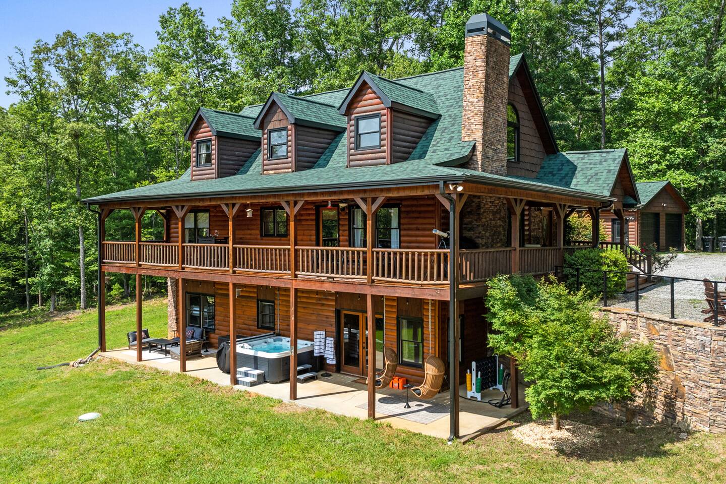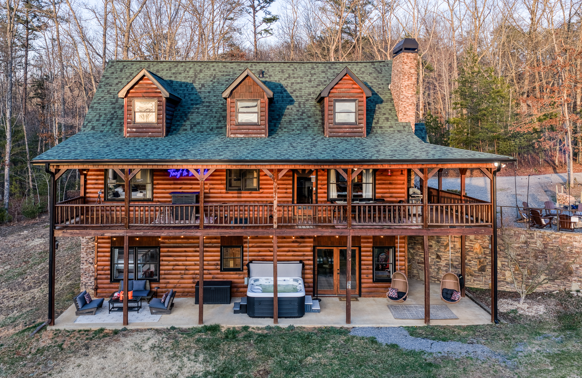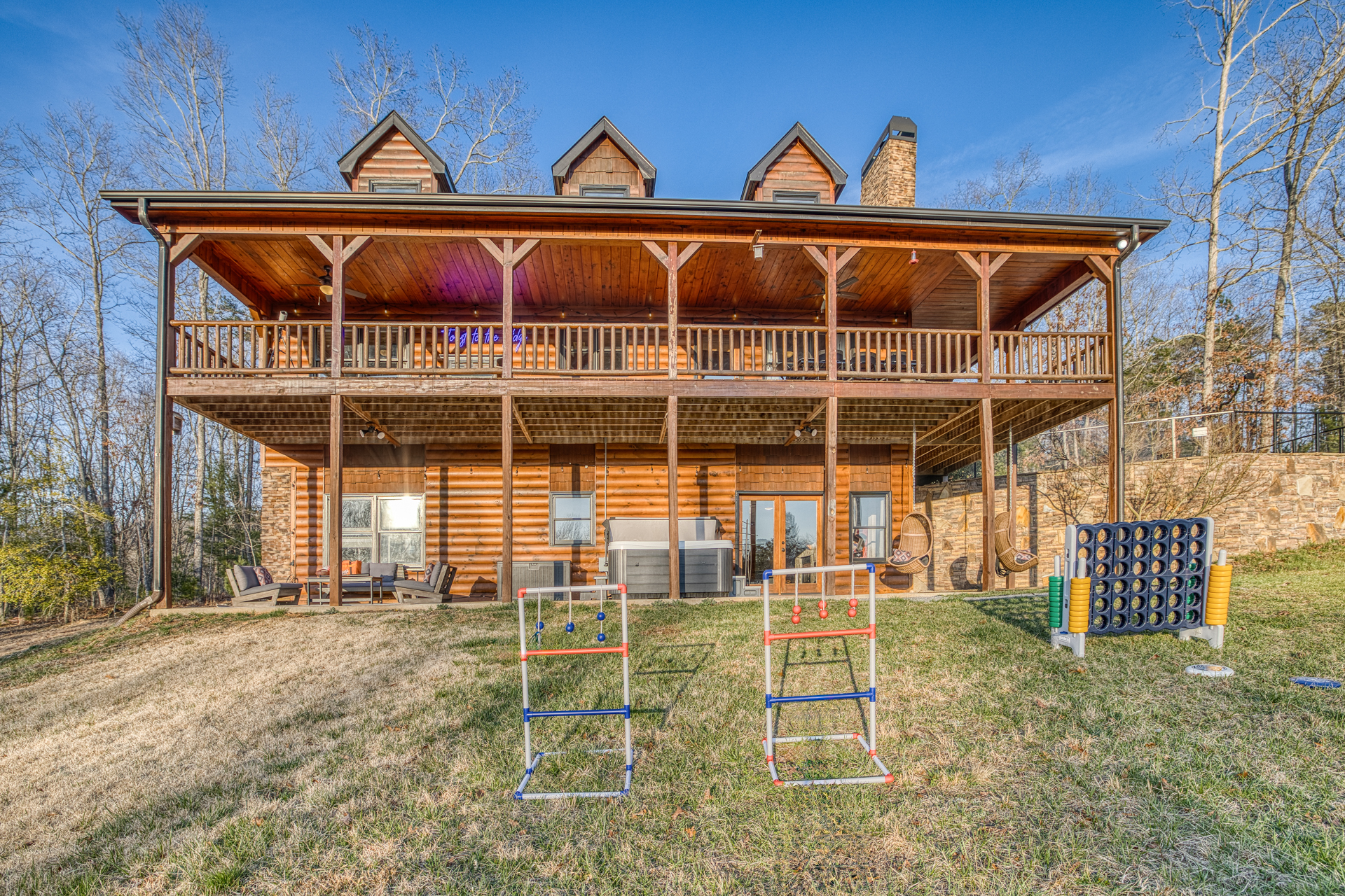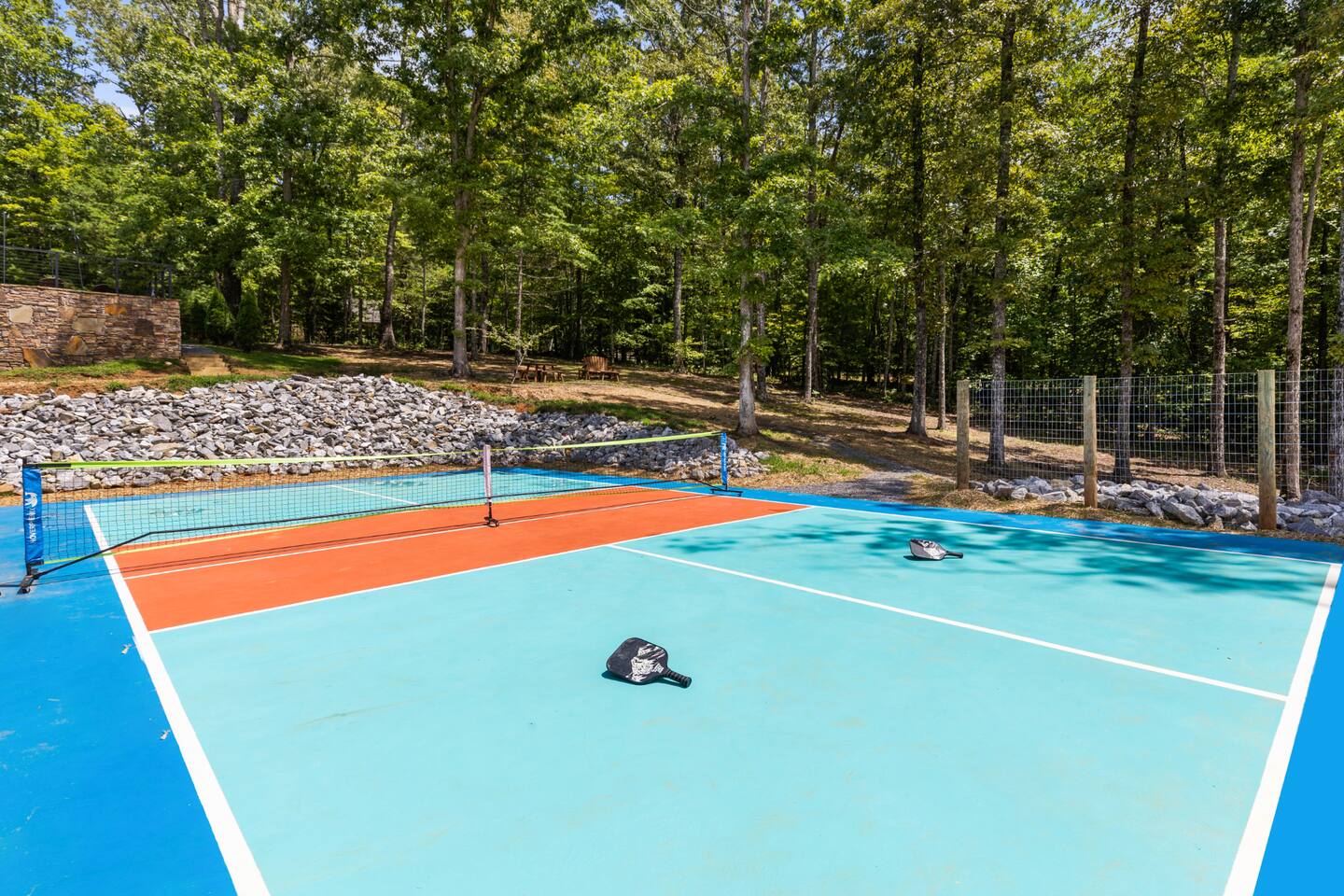 A one-of-a-kind retreat with a private pickleball court, wrap-around deck, covered hot tub, fire pit, and arcade-style game room. 🏷 Main Floor Kitchen & Dining Room ∙ FULLY stocked kitchen w/plenty of counterspace for at-home baking and cooking ∙ Elegant KEUREG, coffee maker, tea kettle, blender and toaster ∙ Cooking oils and seasoning essentials ∙ Abundance of dishware, glassware and silverware, including children’s ∙ Full-sized fridge and freezer ∙ Gas stove and oven ∙ Cuisinart coffee maker ∙ BLACK DECKER coffee drip ∙ Microwave ∙ Airfryer ∙ Trash compactor ∙ Dishwasher ∙ Dining room table, seating for 8 ∙ Large countertop space for food preparation ∙ Breakfast table, 2 high chairs Living Room ∙ 50” Smart TV ∙ Netflix, Prime Video, Disney Plus, Hulu, HBO and more ∙ Sound system ∙ Vaulted ceiling ∙ Fireplace ∙ Ceiling fan ∙ Comfortable velvet sofa ∙ Access to upper deck/balcony Laundry Room ∙ GE high-efficiency washer/dryer ∙ Tide Free and Gentle ∙ Hangers ∙ Drying rack Bedroom #3 ∙ King size bed ∙ Premium mattress and comforter ∙ Smart TV ∙ Room darkening shades ∙ Bedside table and lamp ∙ Large closet w/ hangers ∙ Dresser ∙ Ceiling fan ∙ Full-lenght mirror Bathroom #2 ∙ Shower ∙ Bathtub ∙ Single vanity with oversized mirror and plenty of counterspace ∙ Shampoo, conditioner and body soap ∙ Makeup washcloth 🏷 2nd Floor Bedroom #1 (Primary Bedroom) ∙ King size bed ∙ Premium mattress and comforter ∙ Smart TV ∙ Room darkening shades ∙ Bedside table and lamp ∙ Large closet w/ hangers ∙ Bedroom bench ∙ Dresser ∙ Full-lenght mirror ∙ Workstation/reading table Bathroom #1 (Ensuite) ∙ Shower ∙ Bathtub ∙ Single vanity with oversized mirror and plenty of counterspace ∙ Shampoo, conditioner and body soap ∙ Makeup washcloth 🏷 Bottom Floor/Basement Bedroom #2 ∙ 2 Queen size beds ∙ Premium mattress and comforter ∙ Smart TV ∙ Room darkening shades ∙ Bedside table and lamp ∙ Large closet w/ hangers ∙ Dresser ∙ Ceiling fan ∙ Full-lenght mirror ∙ Luggage rack Bedroom #4 ∙ Queen size bed ∙ Premium mattress and comforter ∙ Smart TV ∙ Room darkening shades ∙ Bedside table and lamp ∙ Large closet w/ hangers ∙ Dresser ∙ Ceiling fan ∙ Full-lenght mirror Bedroom #5 (Bunk Room) ∙ 2 Bunk beds ∙ Premium mattress and comforter ∙ Smart TV ∙ Room darkening shades ∙ Bedside table and lamp ∙ Large closet w/ hangers ∙ Dresser ∙ Full-lenght mirror Game Roon ∙ Smart TV ∙ Fireplace ∙ Ceiling fan ∙ Leather sofa ∙ Board games ∙ Pool table (kid-friendly size) ∙ Foosball/Ping-pong table (kid-friendly size) ∙ NBA Jam arcade machine Bathroom #3 ∙ Shower ∙ Bathtub ∙ Single vanity with oversized mirror and plenty of counterspace ∙ Shampoo, conditioner and body soap ∙ Makeup washcloth 🏷 Outdoor Space(s) Balcony/Upper Deck ∙ Dining table, seating for 8 ∙ Ceiling fan ∙ Rocking chairs ∙ Barbeque grill ∙ Telescope Lower Deck ∙ Outdoor sofa ∙ Hot tub ∙ Swing chairs ∙ Play area ∙ Giant Connect 4 game ∙ Coffee bar Backyard ∙ Pickle ball court ∙ Fire pit ∙ Outdoor seating ∙ Cornhole, Giant Jenga/Connect 4, Ladderball 🏷 Parking ∙ Driveway parking for 6 vehicles 🚘 Nearby ∙ Downtown Blue Ridge (5–10 min): Boutique shops, art galleries, cozy cafés, craft breweries, local eateries. ∙ The Yellowphant Cafe (6–10 min): Popular breakfast/brunch café with a great local vibe. ∙ Rum Cake Lady Cuban Cafe (6–10 min): Must-try Cuban sandwiches & rum cakes. ∙ Misty Mountain Hops (6–10 min): Local brew + burgers in a relaxed outdoor bar setting. ∙ Harvest On Main (6–10 min): Southern comfort cuisine in a welcoming setting. ∙ Southern Charm Restaurant (6–10 min): Classic southern eats perfect for lunch or dinner. ∙ The General Ledger (6–10 min): Casual American fare with a great seasonal menu. ∙ Chester Brunnenmeyer's (6–12 min): Local bar & grill with a fun atmosphere and diverse menu. ∙ THE PASTA MARKET (6–12 min): Highly rated pasta house in town. ∙ Fightingtown Tavern (6–12 min): Classic tavern with local beers and comfort food. ∙ Lake Blue Ridge Marina (12–15 min): Scenic lakeside spot for boating, kayaking, paddleboarding. ∙ Mercier Orchards (12–15 min): Farm market, U-pick fruit (seasonal), cider & fresh pies. ∙ Toccoa River Swinging Bridge (12–18 min): Easy river walk and iconic suspension bridge adventure. ∙ Fall Branch Falls Trail (15–20 min): Family-friendly waterfall hike with scenic forest views. ∙ Aska Trails Area (15–20 min): Extensive hiking & mountain biking trails in Chattahoochee National Forest. ∙ Long Creek Falls Hike (15–20 min): Picturesque waterfall on wooded trail. ∙ Blue Ridge Scenic Railway (10–15 min): Historic train ride along the Toccoa River (seasonal schedules). ∙ Bear Claw Vineyards (15–18 min): Local vineyard with tastings and live music (seasonal). ∙ Serenberry Vineyards (18–22 min): Rustic winery with small-batch wines and scenic tasting area. ∙ Blue Hole Falls – High Shoals Trail (30–40 min): Rewarding waterfall hike in Chattahoochee National Forest.
