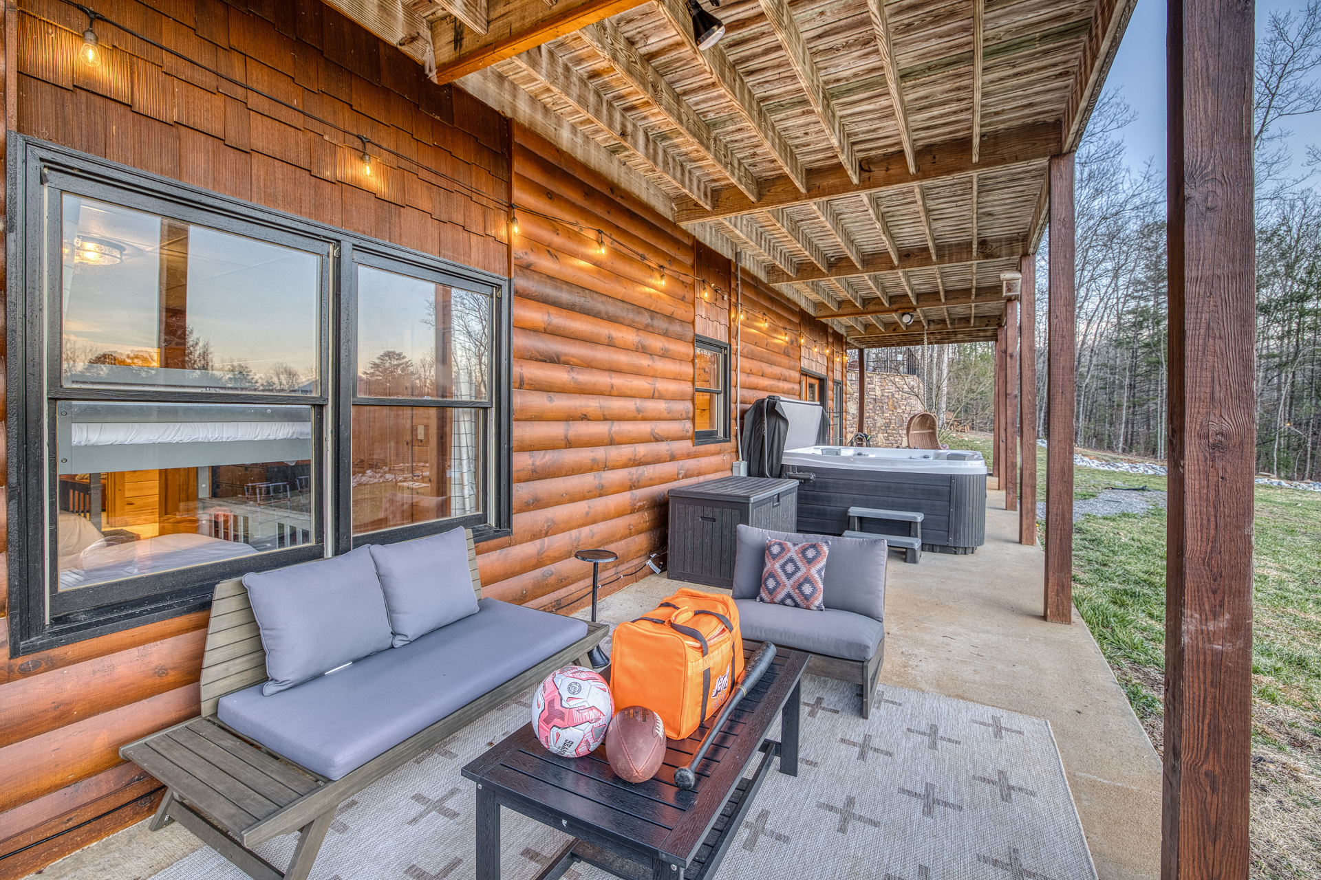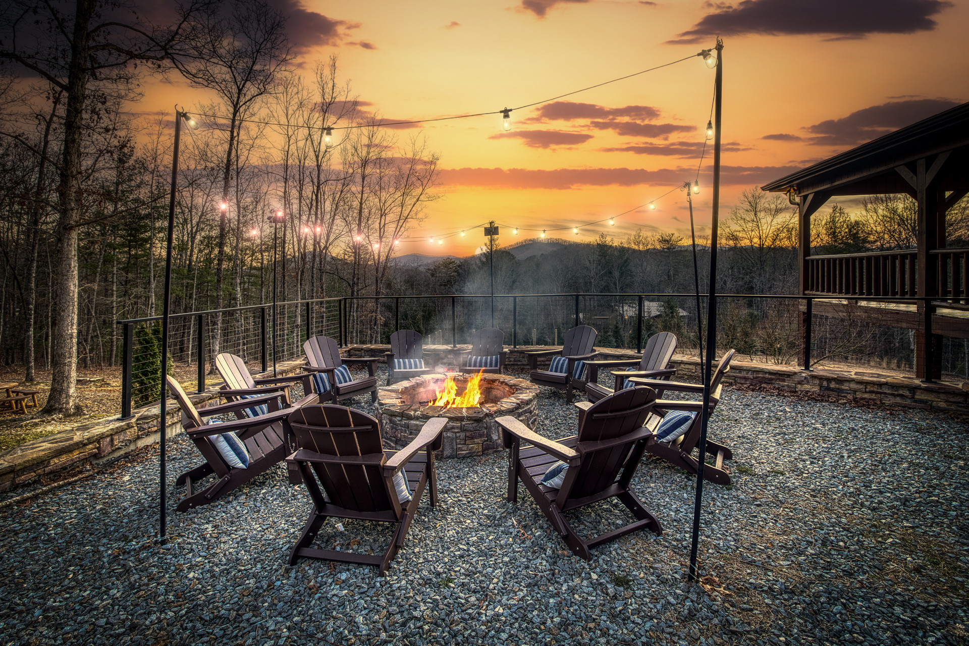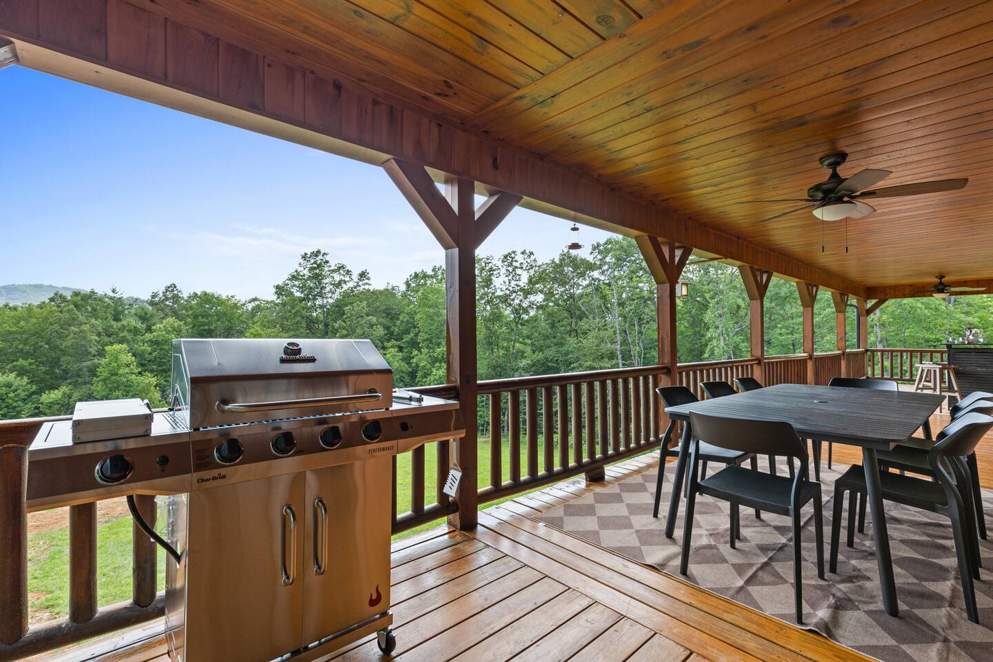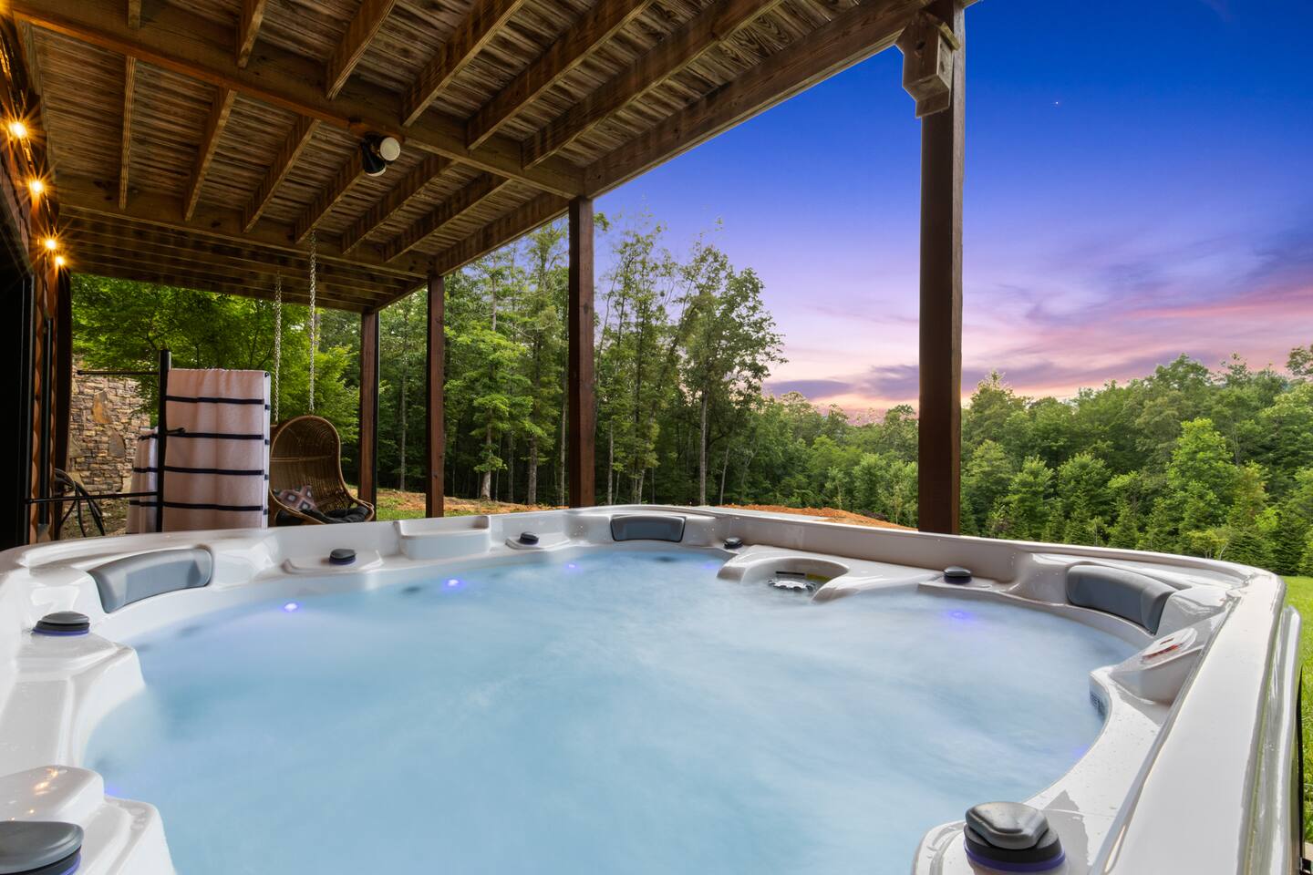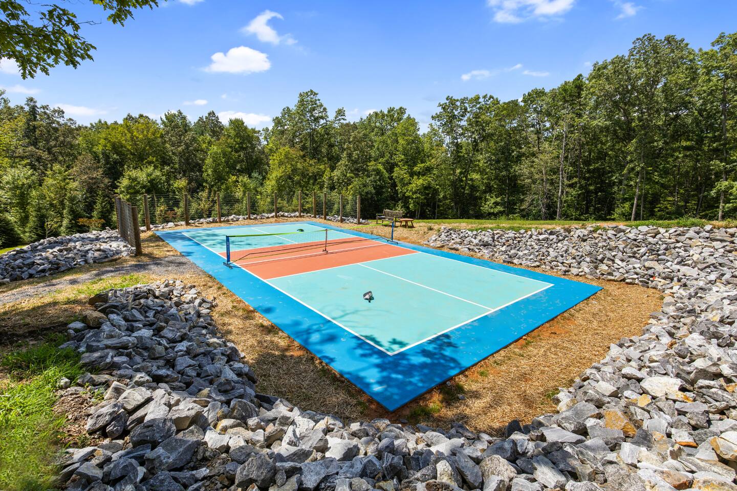 A one-of-a-kind retreat with a private pickleball court, wrap-around deck, covered hot tub, fire pit, and arcade-style game room. 🏷 Main Floor Kitchen & Dining Room ∙ FULLY stocked kitchen w/plenty of counterspace for at-home baking and cooking ∙ Elegant KEUREG, coffee maker, tea kettle, blender and toaster ∙ Cooking oils and seasoning essentials ∙ Abundance of dishware, glassware and silverware, including children’s ∙ Full-sized fridge and freezer ∙ Gas stove and oven ∙ Cuisinart coffee maker ∙ BLACK DECKER coffee drip ∙ Microwave ∙ Airfryer ∙ Trash compactor ∙ Dishwasher ∙ Dining room table, seating for 8 ∙ Large countertop space for food preparation ∙ Breakfast table, 2 high chairs Living Room ∙ 50” Smart TV ∙ Netflix, Prime Video, Disney Plus, Hulu, HBO and more ∙ Sound system ∙ Vaulted ceiling ∙ Fireplace ∙ Ceiling fan ∙ Comfortable velvet sofa ∙ Access to upper deck/balcony Laundry Room ∙ GE high-efficiency washer/dryer ∙ Tide Free and Gentle ∙ Hangers ∙ Drying rack Bedroom #3 ∙ King size bed ∙ Premium mattress and comforter ∙ Smart TV ∙ Room darkening shades ∙ Bedside table and lamp ∙ Large closet w/ hangers ∙ Dresser ∙ Ceiling fan ∙ Full-lenght mirror Bathroom #2 ∙ Shower ∙ Bathtub ∙ Single vanity with oversized mirror and plenty of counterspace ∙ Shampoo, conditioner and body soap ∙ Makeup washcloth 🏷 2nd Floor Bedroom #1 (Primary Bedroom) ∙ King size bed ∙ Premium mattress and comforter ∙ Smart TV ∙ Room darkening shades ∙ Bedside table and lamp ∙ Large closet w/ hangers ∙ Bedroom bench ∙ Dresser ∙ Full-lenght mirror ∙ Workstation/reading table Bathroom #1 (Ensuite) ∙ Shower ∙ Bathtub ∙ Single vanity with oversized mirror and plenty of counterspace ∙ Shampoo, conditioner and body soap ∙ Makeup washcloth 🏷 Bottom Floor/Basement Bedroom #2 ∙ 2 Queen size beds ∙ Premium mattress and comforter ∙ Smart TV ∙ Room darkening shades ∙ Bedside table and lamp ∙ Large closet w/ hangers ∙ Dresser ∙ Ceiling fan ∙ Full-lenght mirror ∙ Luggage rack Bedroom #4 ∙ Queen size bed ∙ Premium mattress and comforter ∙ Smart TV ∙ Room darkening shades ∙ Bedside table and lamp ∙ Large closet w/ hangers ∙ Dresser ∙ Ceiling fan ∙ Full-lenght mirror Bedroom #5 (Bunk Room) ∙ 2 Bunk beds ∙ Premium mattress and comforter ∙ Smart TV ∙ Room darkening shades ∙ Bedside table and lamp ∙ Large closet w/ hangers ∙ Dresser ∙ Full-lenght mirror Game Roon ∙ Smart TV ∙ Fireplace ∙ Ceiling fan ∙ Leather sofa ∙ Board games ∙ Pool table (kid-friendly size) ∙ Foosball/Ping-pong table (kid-friendly size) ∙ NBA Jam arcade machine Bathroom #3 ∙ Shower ∙ Bathtub ∙ Single vanity with oversized mirror and plenty of counterspace ∙ Shampoo, conditioner and body soap ∙ Makeup washcloth 🏷 Outdoor Space(s) Balcony/Upper Deck ∙ Dining table, seating for 8 ∙ Ceiling fan ∙ Rocking chairs ∙ Barbeque grill ∙ Telescope Lower Deck ∙ Outdoor sofa ∙ Hot tub ∙ Swing chairs ∙ Play area ∙ Giant Connect 4 game ∙ Coffee bar Backyard ∙ Pickle ball court ∙ Fire pit ∙ Outdoor seating ∙ Cornhole, Giant Jenga/Connect 4, Ladderball 🏷 Parking ∙ Driveway parking for 6 vehicles 🚘 Nearby ∙ Downtown Blue Ridge (5–10 min): Boutique shops, art galleries, cozy cafés, craft breweries, local eateries. ∙ The Yellowphant Cafe (6–10 min): Popular breakfast/brunch café with a great local vibe. ∙ Rum Cake Lady Cuban Cafe (6–10 min): Must-try Cuban sandwiches & rum cakes. ∙ Misty Mountain Hops (6–10 min): Local brew + burgers in a relaxed outdoor bar setting. ∙ Harvest On Main (6–10 min): Southern comfort cuisine in a welcoming setting. ∙ Southern Charm Restaurant (6–10 min): Classic southern eats perfect for lunch or dinner. ∙ The General Ledger (6–10 min): Casual American fare with a great seasonal menu. ∙ Chester Brunnenmeyer's (6–12 min): Local bar & grill with a fun atmosphere and diverse menu. ∙ THE PASTA MARKET (6–12 min): Highly rated pasta house in town. ∙ Fightingtown Tavern (6–12 min): Classic tavern with local beers and comfort food. ∙ Lake Blue Ridge Marina (12–15 min): Scenic lakeside spot for boating, kayaking, paddleboarding. ∙ Mercier Orchards (12–15 min): Farm market, U-pick fruit (seasonal), cider & fresh pies. ∙ Toccoa River Swinging Bridge (12–18 min): Easy river walk and iconic suspension bridge adventure. ∙ Fall Branch Falls Trail (15–20 min): Family-friendly waterfall hike with scenic forest views. ∙ Aska Trails Area (15–20 min): Extensive hiking & mountain biking trails in Chattahoochee National Forest. ∙ Long Creek Falls Hike (15–20 min): Picturesque waterfall on wooded trail. ∙ Blue Ridge Scenic Railway (10–15 min): Historic train ride along the Toccoa River (seasonal schedules). ∙ Bear Claw Vineyards (15–18 min): Local vineyard with tastings and live music (seasonal). ∙ Serenberry Vineyards (18–22 min): Rustic winery with small-batch wines and scenic tasting area. ∙ Blue Hole Falls – High Shoals Trail (30–40 min): Rewarding waterfall hike in Chattahoochee National Forest.